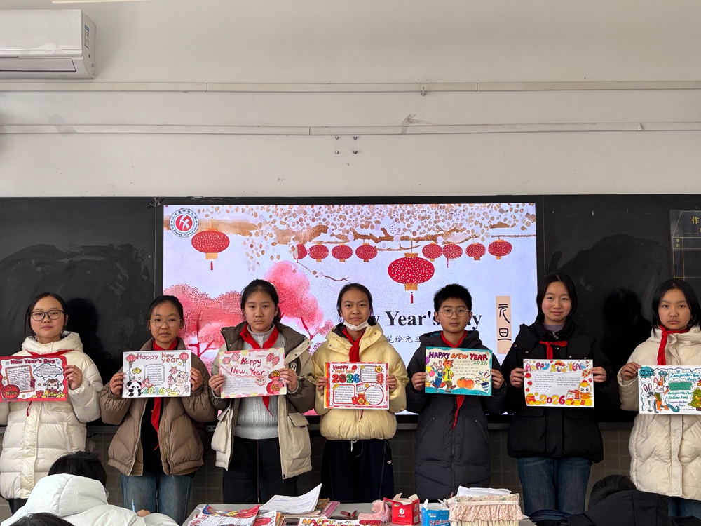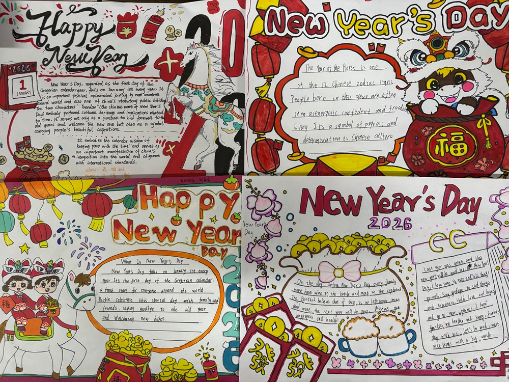 一纸一笔皆创意,一词一句展风采。活动中,同学们化身小小设计师,以元旦为主题,将英语知识与艺术创意巧妙融合。他们围绕新年祝福、中外元旦习俗、新年心愿等板块精心构思,用工整的英文字体写下真挚的祝福,用多彩的画笔绘出节日的喜庆。有的同学摘抄了趣味英语新年小诗,有的同学手绘了中西方元旦庆祝场景对比图,还有的同学用可爱的卡通形象点缀版面……每一份手抄报都主题鲜明、图文并茂,不仅展现了同学们扎实的英语基础,更彰显了大家丰富的想象力和创造力。