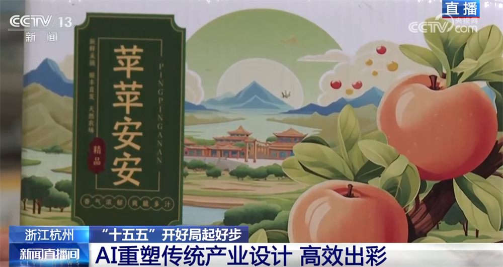 咱们先来看设计环节。工厂通过自主开发的AI设计引擎,通过输入内容,它就能自动生成出相应的图片。比如这是为山西运城的苹果AI自动生成的差异化包装方案,融入了晋南古建筑、黄河等地域符号。有了AI帮忙设计,单次设计成本从5000元降至200元以内,还能将传统7—15天的设计周期压缩至60分钟。